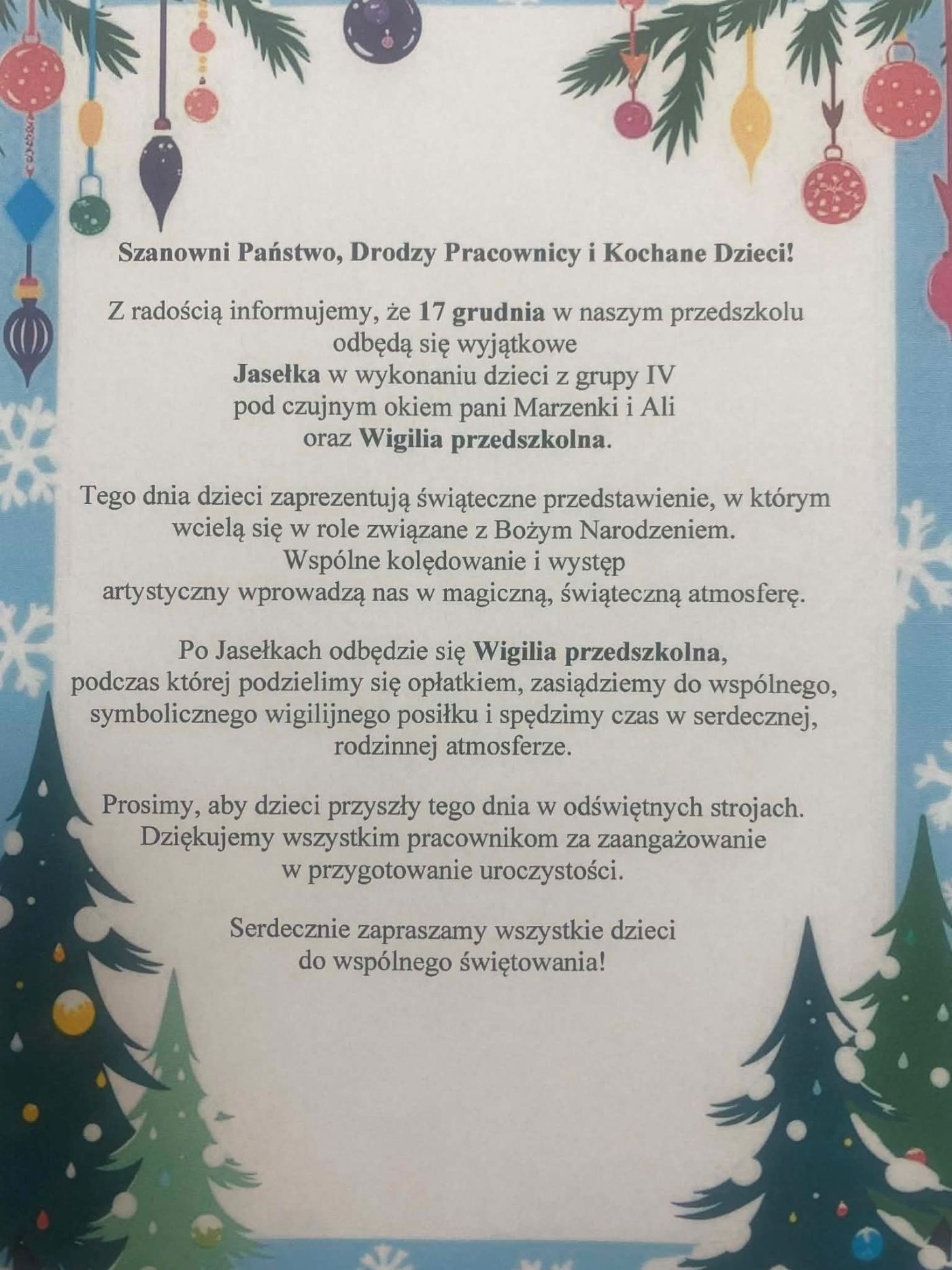 Dnia 5 grudnia w naszym przedszkolu odbyło się wyjątkowe spotkanie ze Świętym Mikołajem. Dzieci z ogromnym entuzjazmem powitały gościa, śpiewając przygotowane piosenki i recytując krótkie wierszyki. Mikołaj porozmawiał z każdym dzieckiem, pytał o marzenia świąteczne oraz chwalił za dobre zachowanie. Na zakończenie wręczył wszystkim przedszkolakom prezenty. Spotkanie przebiegło w radosnej, świątecznej atmosferze i dostarczyło dzieciom wielu niezapomnianych wrażeń. Kilka zdjęć z wydażenia GALERIA